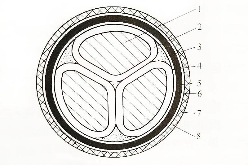 油浸紙絕緣電纜:包括鉛包、鋁包、鎧裝和無鎧裝等。常見的三芯油浸紙絕緣電纜結(jié)構(gòu)圖如圖所示。